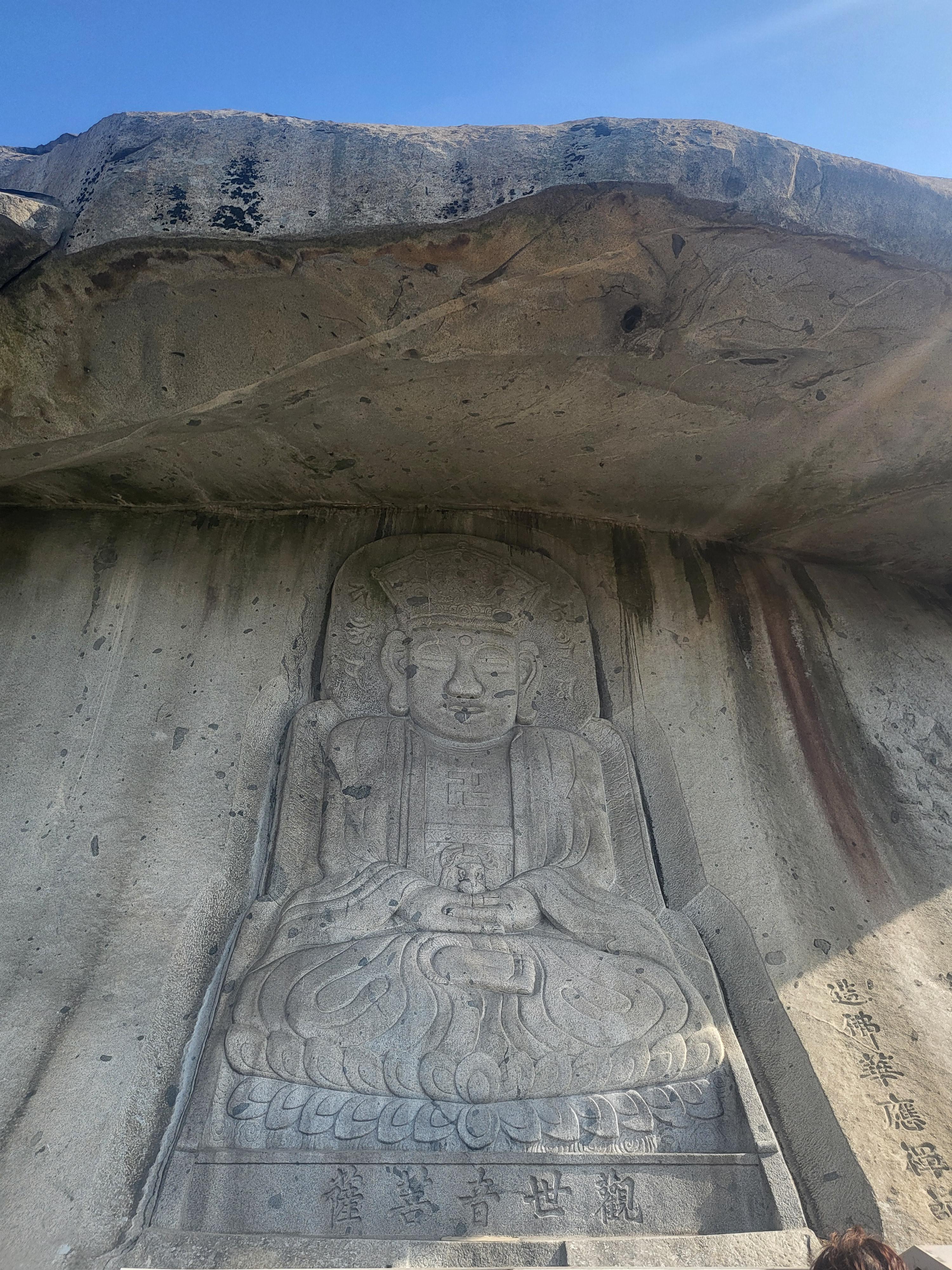 꼭대기까지 올라가면 눈썹바위 아래 서해를 바라보고 있는 인자한 표정의 돌에 새겨진 불상이 있다. 그냥 한번 꾸벅 인사해봤다.